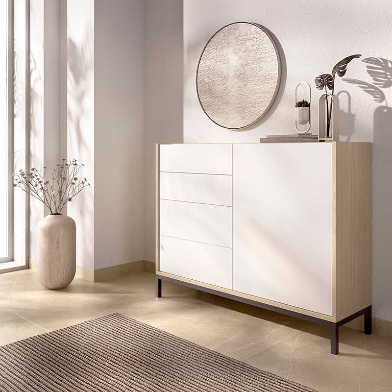 Aparador bicolor en Roble y Blanco con patas metálicas negras.