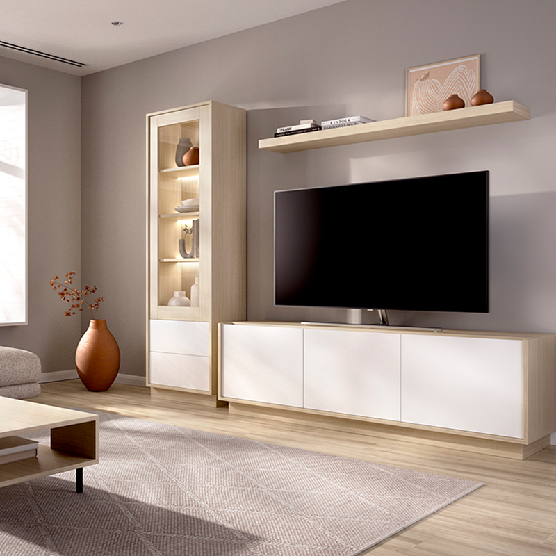 Aparador de pared blanco, con diseño limpio y almacenamiento funcional.