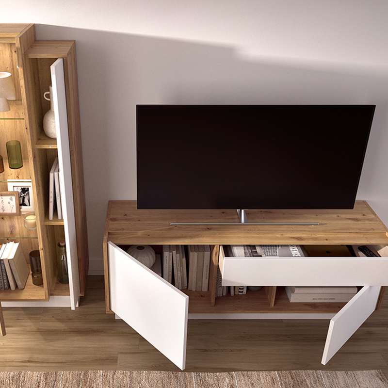 Mueble de TV de 232 cm de largo y 154 de alto con acabado en blanco y roble nórdico, acompañado de una vitrina de almacenamiento vertical con estantes iluminados.