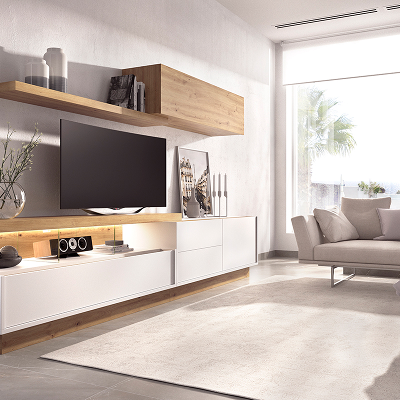 Aparador largo en blanco y roble nórdico