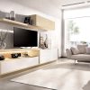 Mueble de TV de 270 cm X 185 cm en blanco y roble nórdico, con estante superior flotante y luz LED integrada.