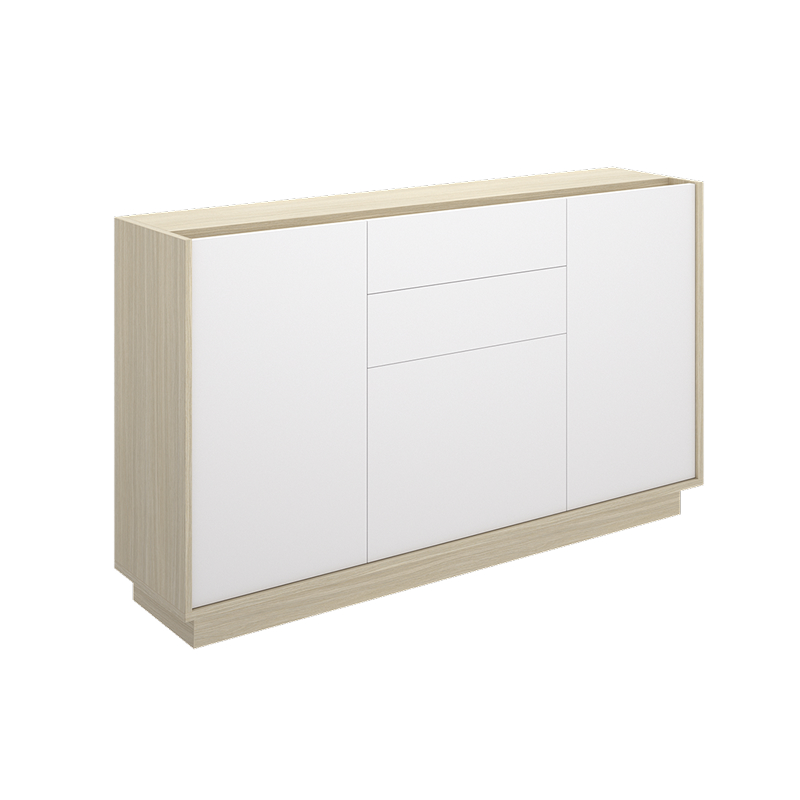 Aparador con acabados en roble y blanco, diseño moderno con almacenamiento funcional.