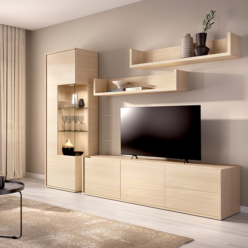Aparador con acabados en roble, estante superior y vitrina lateral iluminada.