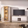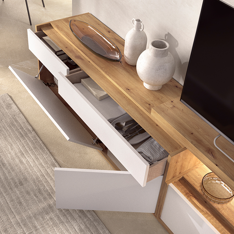 Mueble de TV con 270 cm de largo y 56cm de alto, acabado en blanco y roble nórdico, con almacenamiento práctico y luces LED integradas.