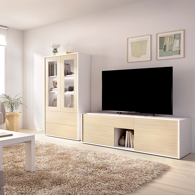 Composición de salón en blanco y roble con vitrina iluminada