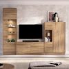 Composición de salón en blanco y roble con vitrina de cristal e iluminación LED integrada.