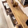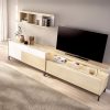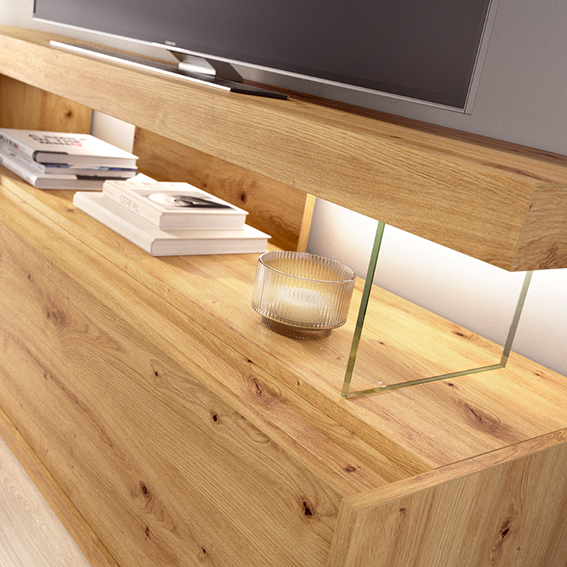 Composición de salón en acabado nórdico y grafito con módulo bajo para TV y estante superior a juego.