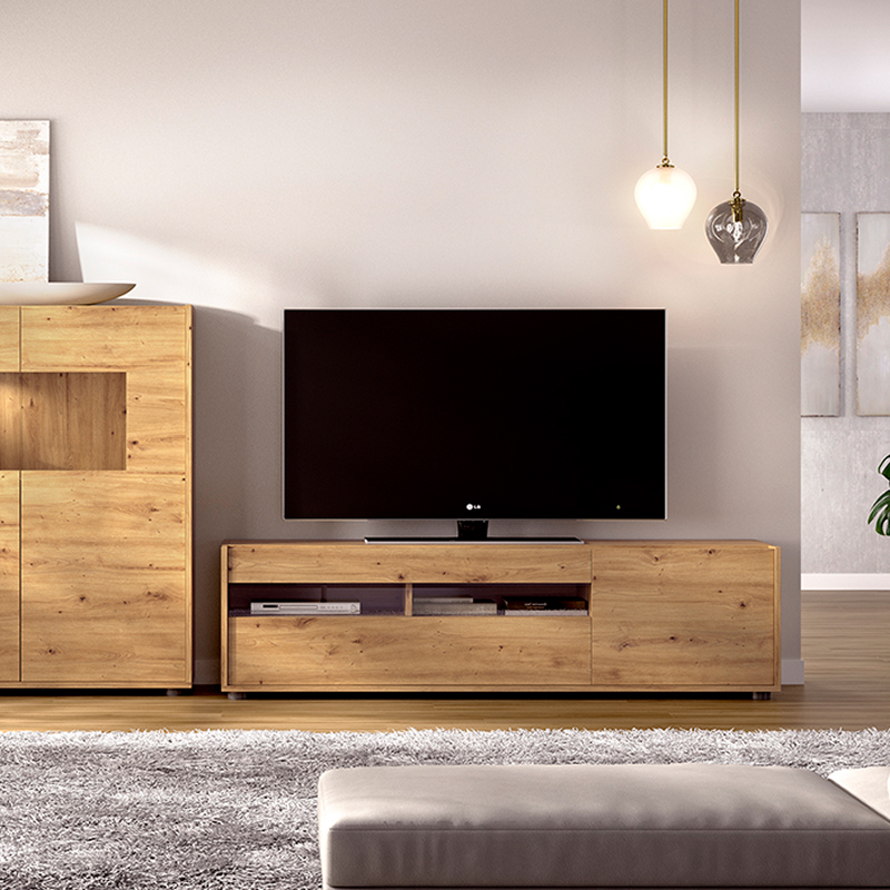 Composición de salón en acabado nórdico con vitrina y módulo bajo TV.