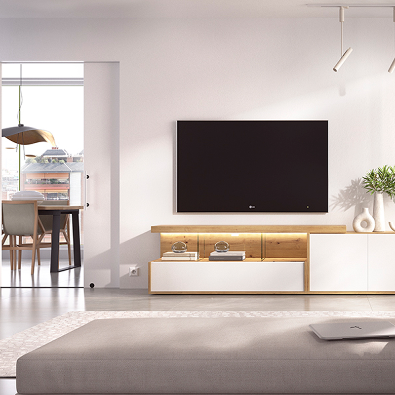 Composición modular con vitrina iluminada y mueble bajo para TV.