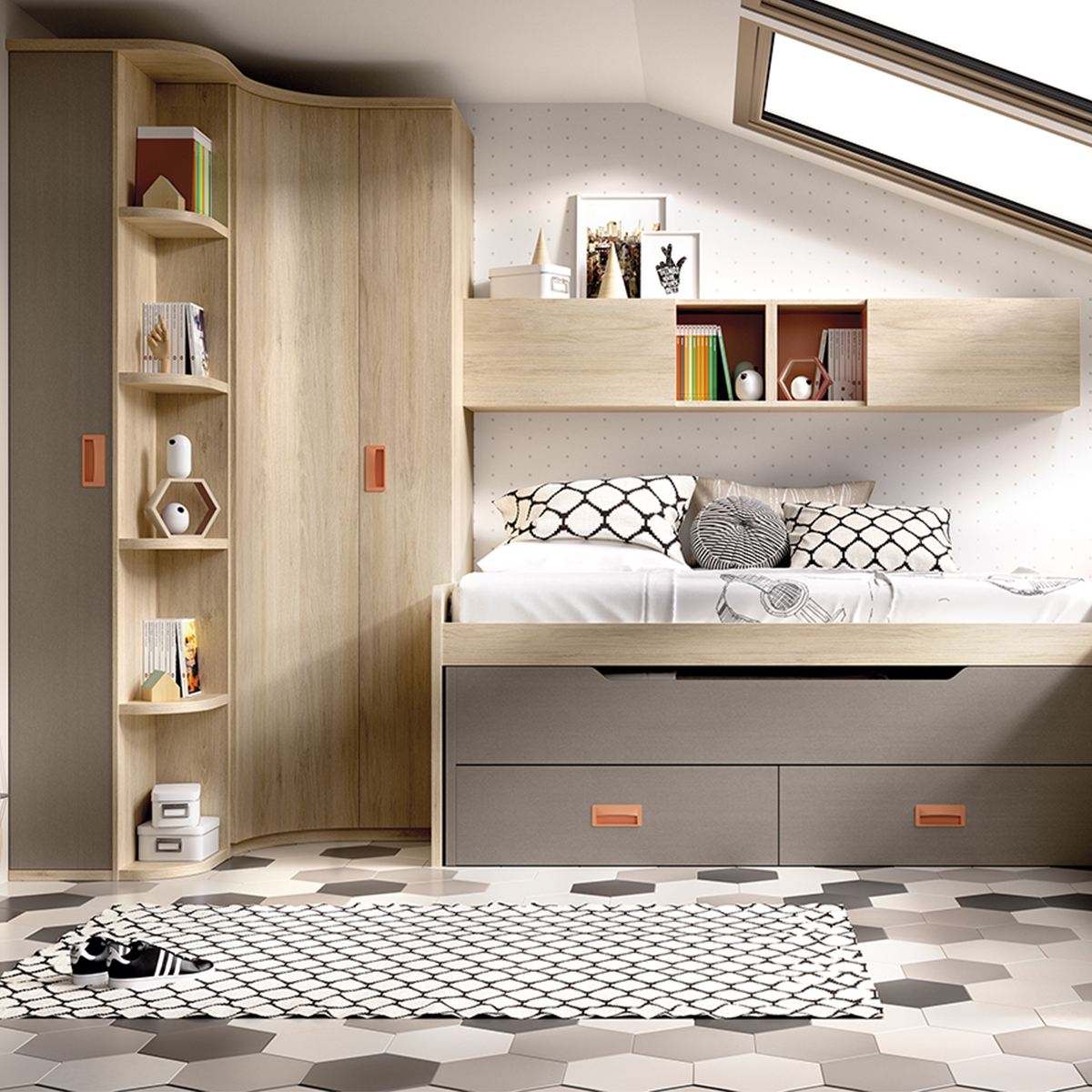 Composición acogedora, confortable y práctica. Cuenta con un moderno armario esquinero con tres puertas para aprovechar al máximo el espacio, además de una estantería vertical integrada en al mismo armario. Una cama nido de triple altura con cajones en la parte inferior y otra cama extraible en la parte del medio. La combinación de colores es perfecta, ya que el gris aporta la elegancia y el tono madera la luminosidad al entorno. Te damos la posibilidad de que combines los módulos de esta composición en función de tus necesidades. ¡Juvenil, luminosa y cómoda, ideal para tu hijo!