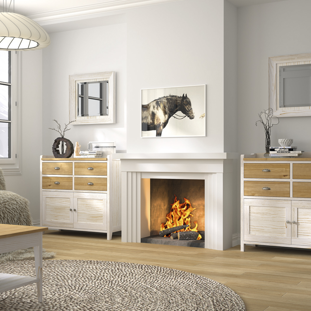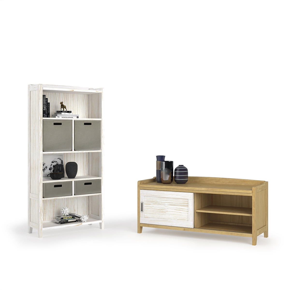 Composición de salón que combina un frente liso y otro acabado en madera. Una composición hecha de un material de gran calidad, que te ofrece diferentes posibilidades de almacenaje. Puedes escoger la combinación de muebles que mejor se adapte a tu hogar.