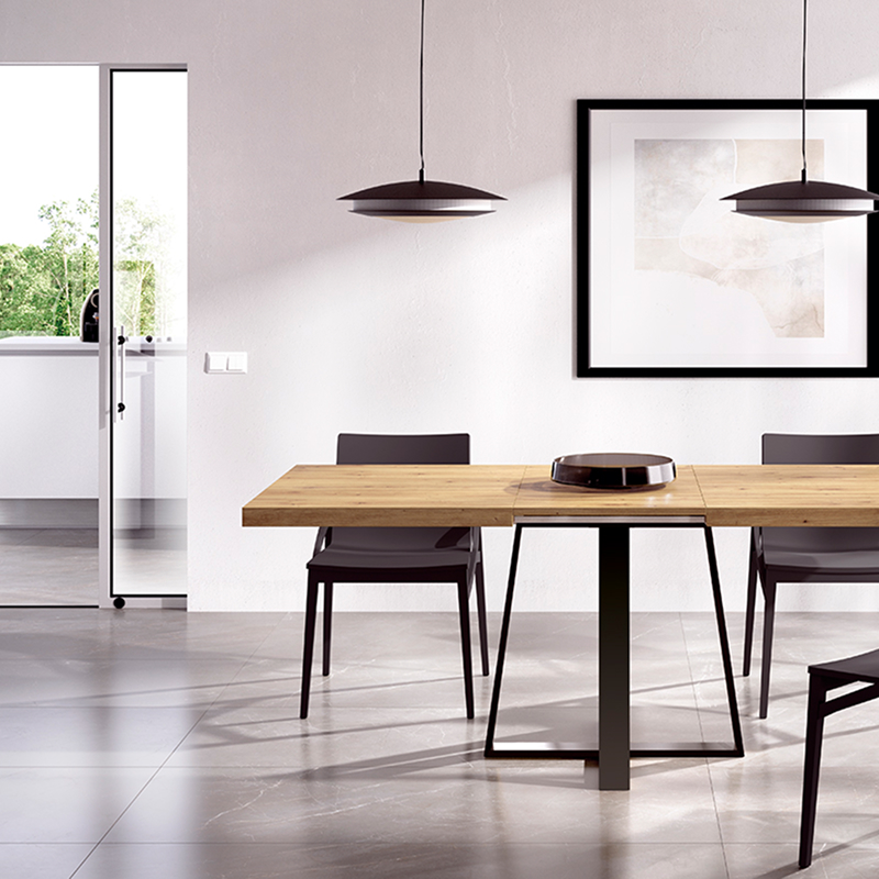 Mesa de comedor extensible en acabado nórdico con base metálica.