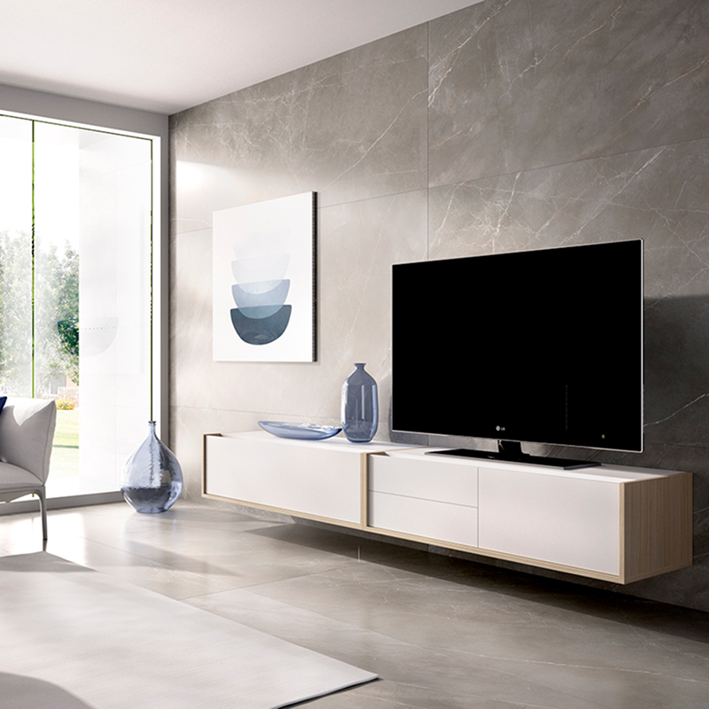 Mueble de salón suspendido en acabado blanco y roble con diseño moderno y funcional.
