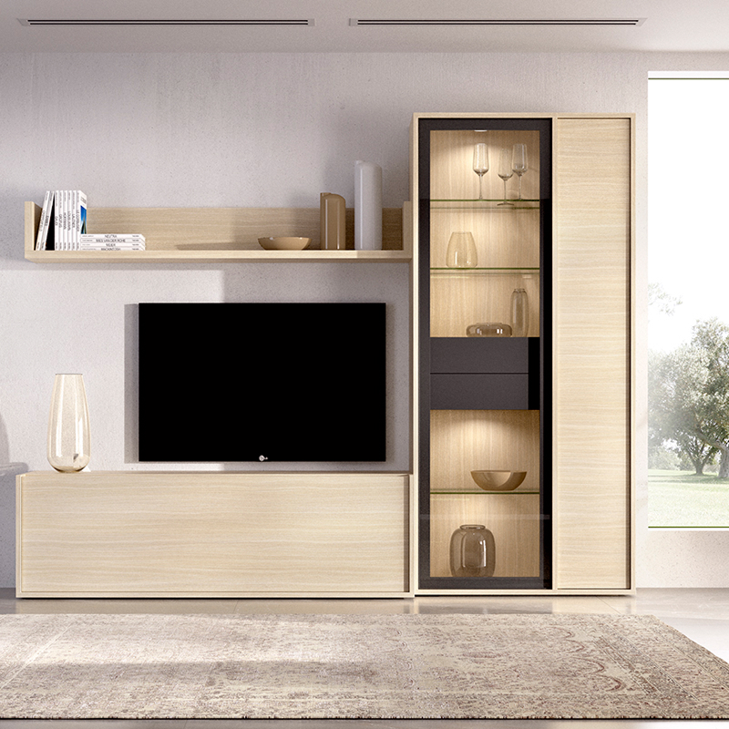 Conjunto de salón con vitrina combinada en roble y grafito.